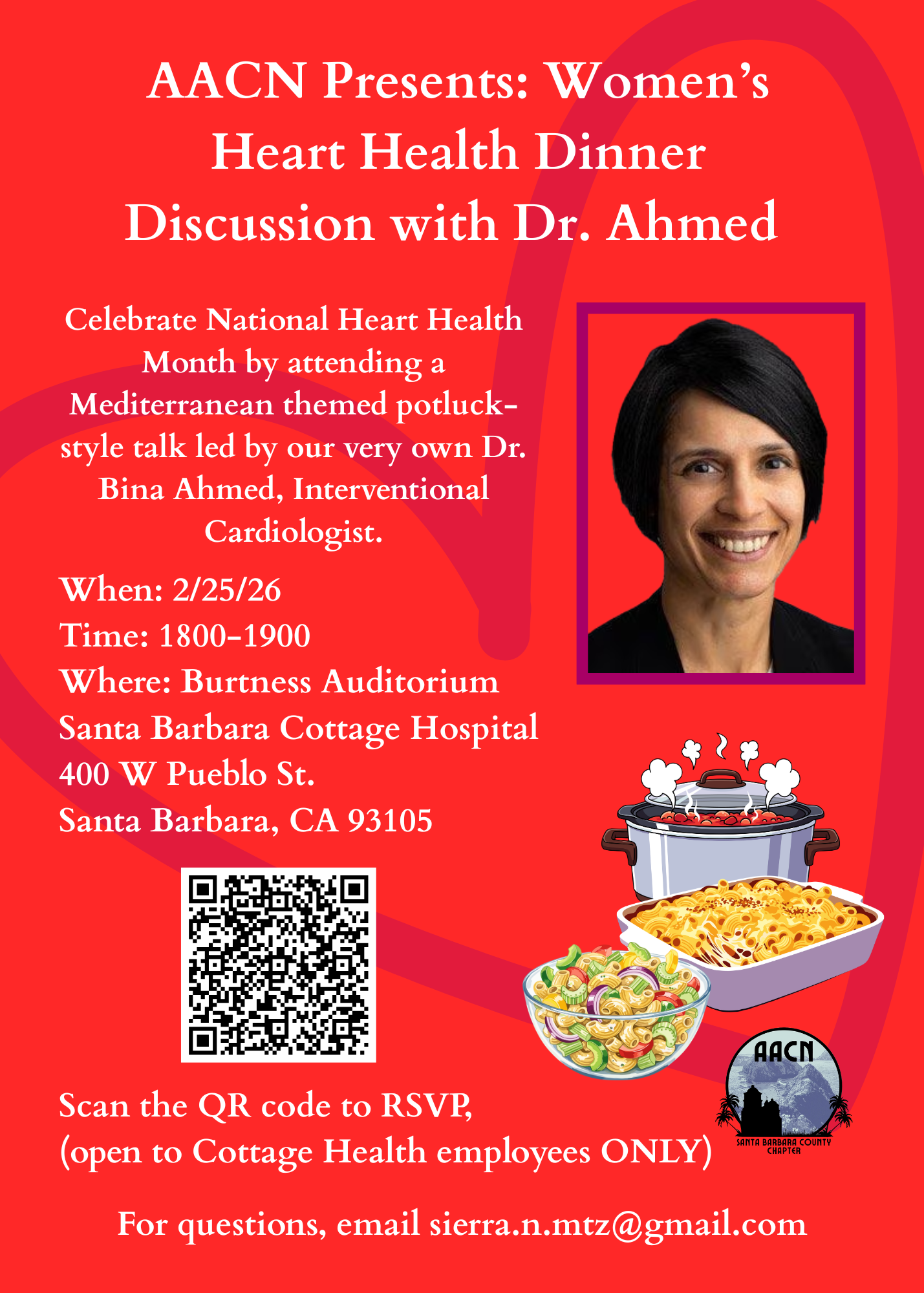 Women’s Heart Health Dinner Discussion with Dr. Ahmed Santa Barbara Cottage Hospital - Burtness 400 West Pueblo StreetSanta Barbara, CA 93105 Wednesday, February 25, 2026 at 6:00pm PT - 7:30pm PT Posted by The Santa Barbara County Chapter of AACN Info Speakers Register Info Attachments Dr. Ahmed's Talk (750 KB) Additional Information Celebrate Women’s Heart Month by attending a Mediterranean themed pot-luck and talk from Dr. Ahmed, Interventional Cardiologist. Attendees are encouraged to bring a Mediterranean themed dish and recipe to share! Speakers Bina Ahmed MD Interested in attending this event? Enter your email address below to register for this event. If you do not have an account, create your account. Your email address Register to attend